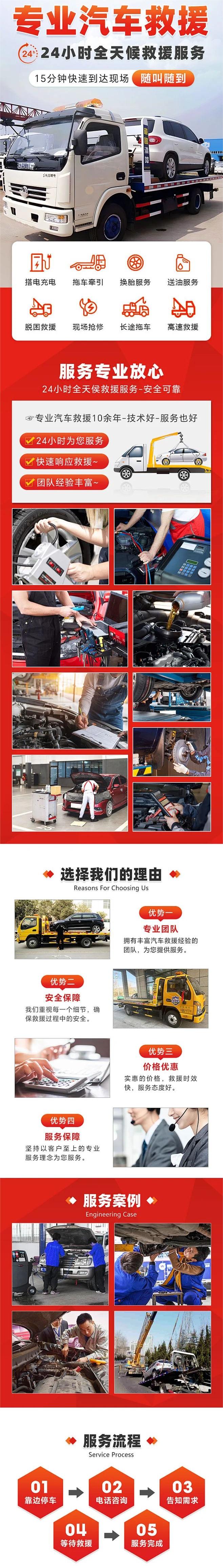 我们致力于全国道路救援服务,从事道路救援行业十多年,受到了广大客户的一致好评。我们实行全年365天24小时提供紧急道路救援服务,节假日无休,且诚信经营不加价。提供上门修理汽车各种故障,电脑检测,发动机启动困难,变速箱,水温高,油路,汽车电路、离合器、刹车等故障。现场排除,拖车救援,开车门锁救援、送油送水、流动补胎、换胎服务、拖车吊车、脱困救援。我们在全市各个范围都有救援人员,根据现场所在位置安排最近的师傅上门救援,不论您在哪里,我们会以最快的时间赶到您身边,为您解决问题。最快15分钟到达救援现场,解决各种车辆问题,给您带来方便,节约您的宝贵时间。